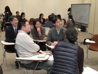ワークショップはフォーラム2日目の午後に開催され、当日午前中のシンポジウムでお話しされた先生方を中心に、4つのグループに分かれて行いました。当日その場で出会った、文化科学を専攻とする大学院生がとある先生の旗下に集まり、ある程度定められたテーマの下で共同研究会を開くとすれば、どのような題目で各々の研究が展開できるかを探るのが、今回のワークショップの目的でありました。各グループのメンバーに求めるのは自分の研究領域を説明する独創性や熟練さだけでなく、他分野研究者との協力の可能性を高める広い視野も要求されます。一見なかなか実行の難しい内容ではありましたが、討論は各メンバーの自己紹介から始まり、熱意あるやり取りと各班の学生企画委員スタッフによる進行とまとめによって、野本忠司先生(日本文学研究専攻)の「技術・文化の伝播のための社会的要因に関する研究」、中牧弘允先生(比較文化学専攻)の「近代から現代への美意識の変容――インターディシプリナリーの視点から」、井上章一先生(国際日本研究専攻)の「下からのポップカルチャア」、日高薫先生(日本歴史研究専攻)の「唐蛮貨物帳にみる文物の往来と受容」という4つの共同研究会が立ち上げ準備(想定)の段階まで進みました。