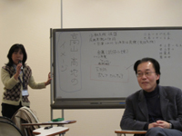 「井上先生班」は井上章一先生を中心に、絵巻物を研究する徳永誓子、台湾原住民(高山族)の粟を研究する林麗英、植民地文学を研究する韓玲玲から成りました。3名の学生参加者が各自のキーワードを持ち寄りまして、井上先生の提起なされた「下からのポップカルチャー」というテーマをめぐって、話しは熱っぽく展開していきました。「カルチャー」の上に立てられたものとして、まず、「華道」や「茶道」とは違って、流派によって組織されていない「盆栽」が着目されました。井上先生の柔軟な誘導で、学生たち個々の研究視野も徐々に広がっていきました。話しは最初の「盆栽」から、「少数民族」の民族意識に飛び、香港の武侠小説「金庸」とか、日本の「サンカ(山窩)」とかまでに拡大していきました。その中で、絵巻作品に描かれた「雪女」から「少数民族」の住む「高山」にと論は結びつき、植民地の視点から論じられる「高山・高地」のロマンチックなイメージが参加者全員の興味をそそり、研究班のテーマも「高山・高地のイメージ」というところに絞られていきました。研究者それぞれの持つ問題意識が「カルチャー」という大きな土台の上に遭遇し、それらがいったん討論(言語と思想の力)によって破壊され、やがて全員共通のテーマへと再構成・統合されていったのでした。その過程を通しての刺激的な体験が、今回のワークショップでの一番大きな収穫だったと思います。(韓玲玲)